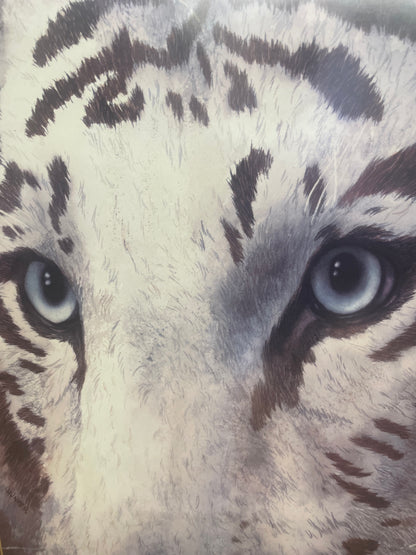 Used Tiger face print. No major damage to the picture or frame . The frame has a few water marks . Hanging brackets are intact. 29W X 35H. 011212Aug24.