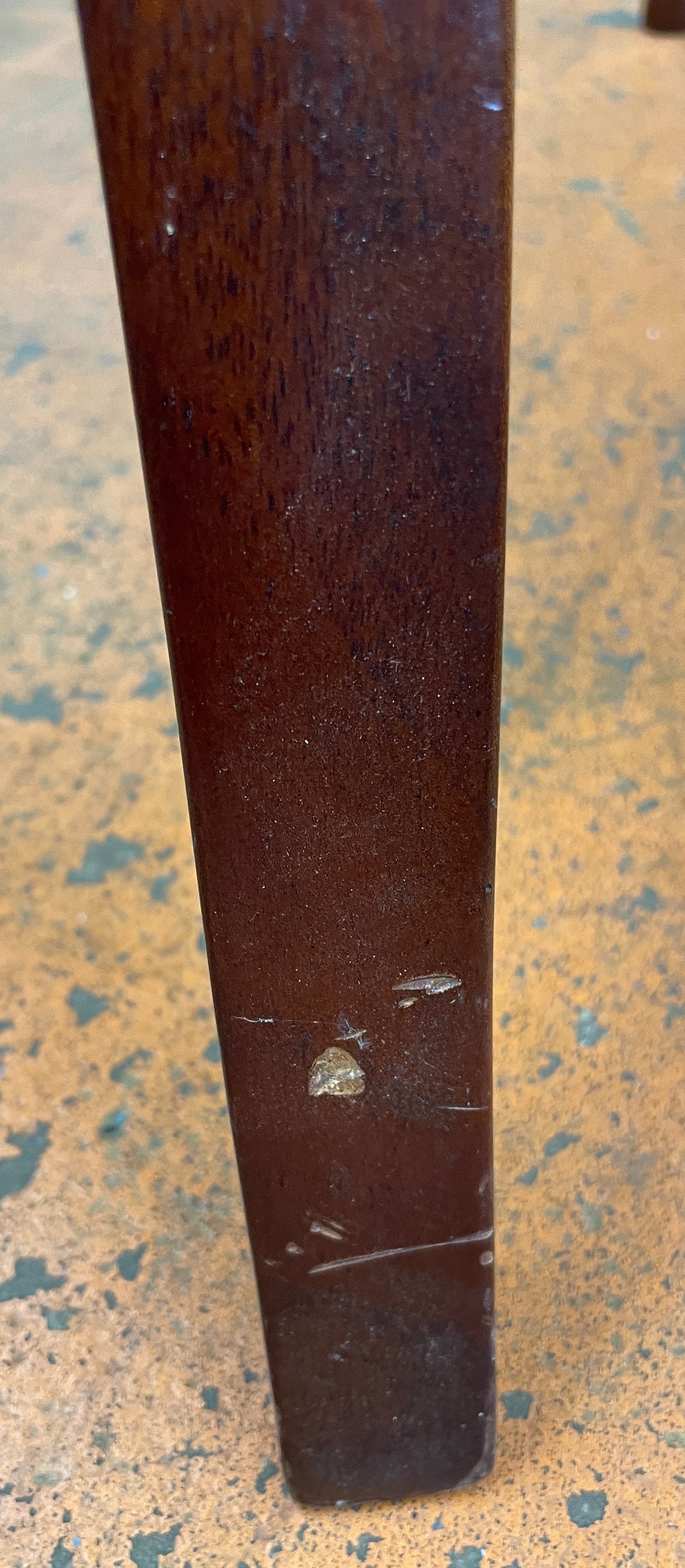 Very nice chair with a slight wobble. Has a few chips and scratches. I don’t know if it has been reupholstered or this is the original fabric. 20Wx17Dx35H